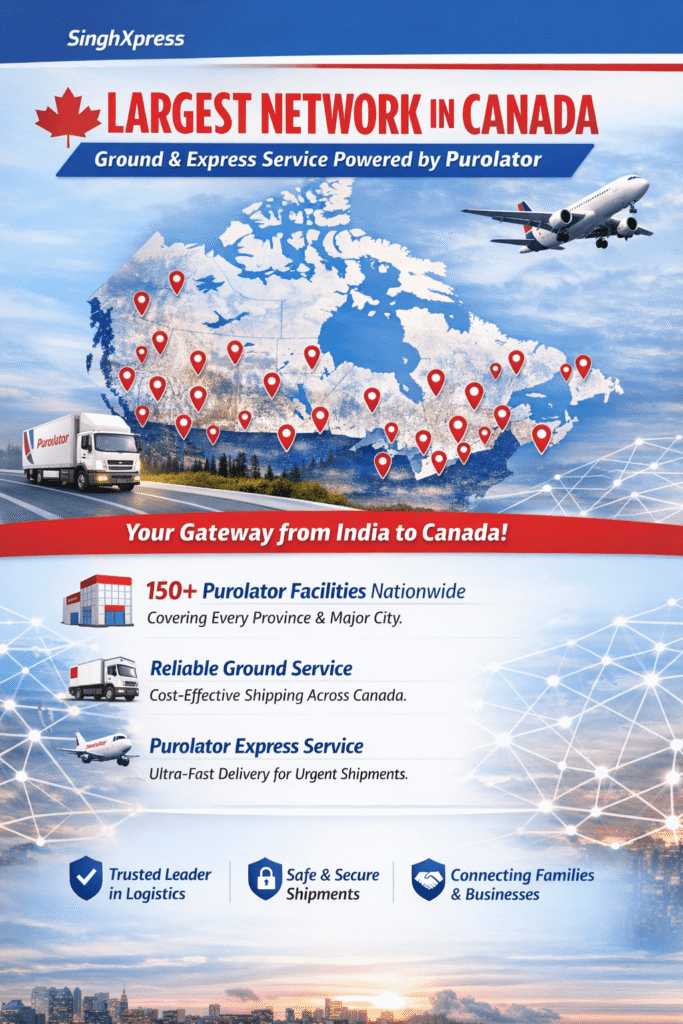 When shipping from India to Canada, the most important factor after customs clearance is strong domestic delivery inside Canada. That’s where Singh International Xpress (SinghXpress) stands out—by connecting your shipment to Canada’s largest ground and express delivery network, powered by Purolator.
